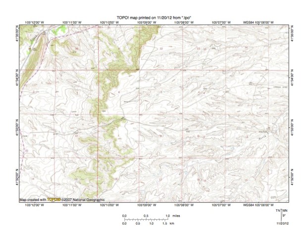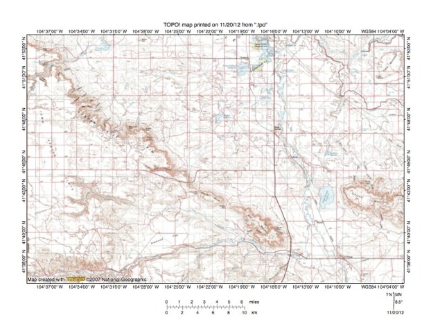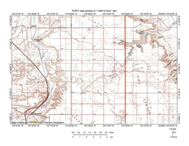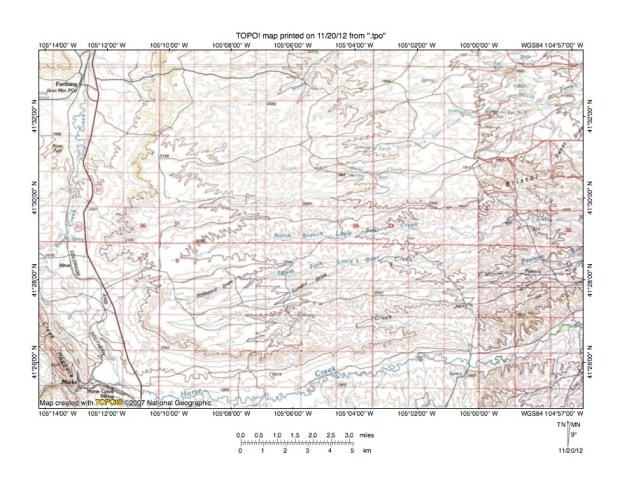 Figure 8: Chugwater Creek-Box Elder Creek drainage divide area. United States Geological Survey map digitally presented using National Geographic Society TOPO software.