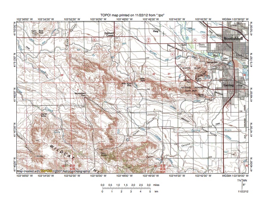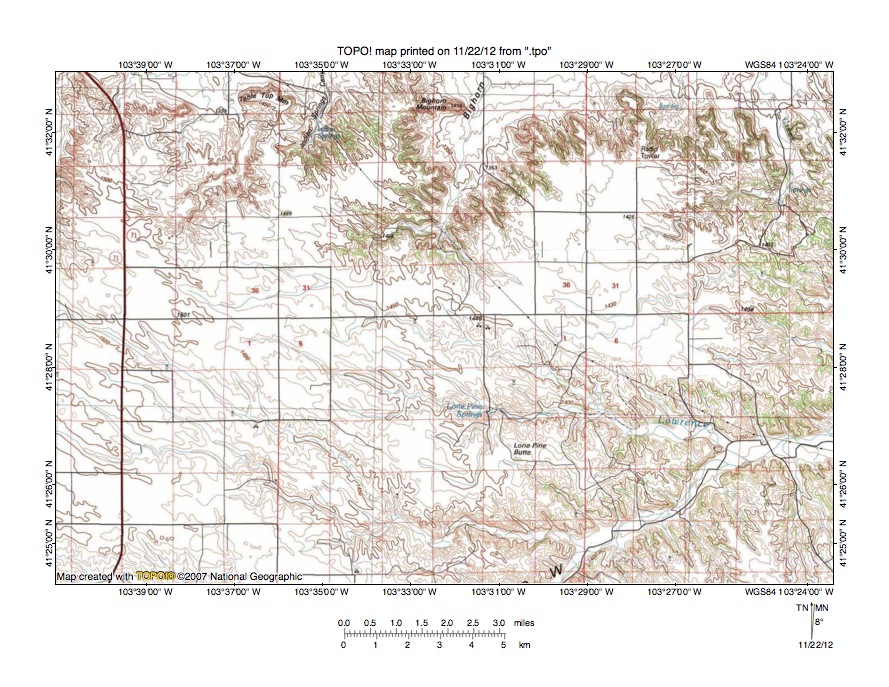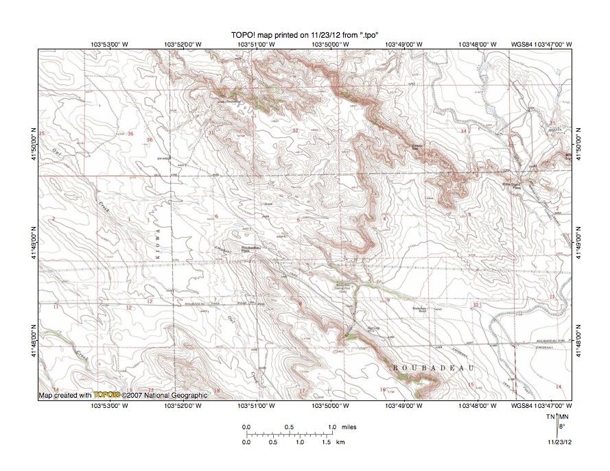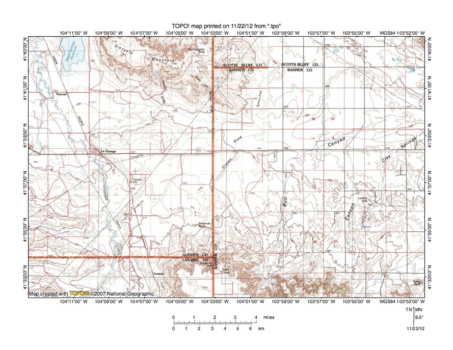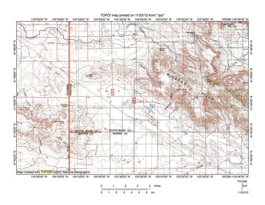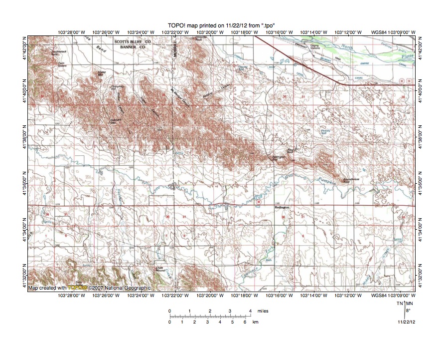 Figure 10: North Platte River-Pumpkin Creek drainage divide area. United States Geological Survey map digitally presented using National Geographic Society TOPO software.
