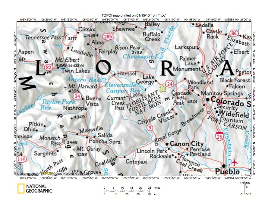Figure 1: South Platte River-Arkansas River drainage divide area location map (select and click on maps to enlarge). National Geographic Society map digitally presented using National Geographic Society TOPO software.