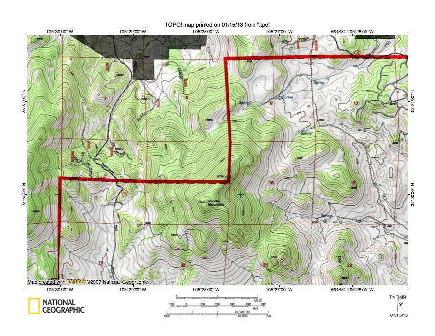 Figure 9: Grape Creek-Fourmile Creek drainage divide area. United States Geological Survey map digitally presented using National Geographic Society TOPO software.