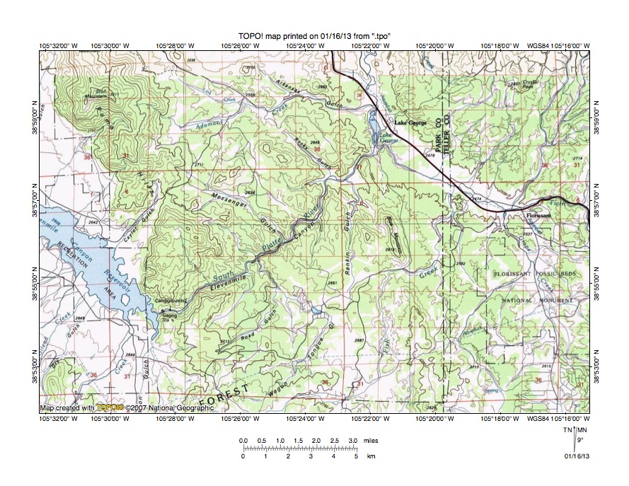Figure 8: South Platte River-Fish Creek drainage divide area. United States Geological Survey map digitally presented using National Geographic Society TOPO software.