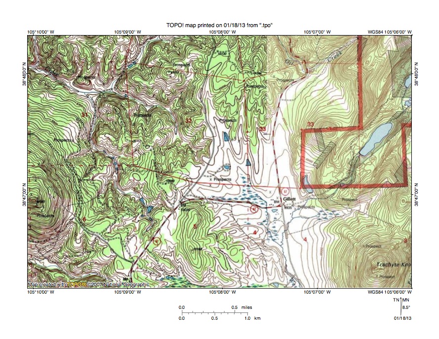 Figure 10 provides a detailed topographic map of the Oil Creek-West Fork Beaver Creek drainage divide area seen in less detail in figure 9. The map contour interval for figure 10 is 40 feet. Trachyte Knob is located near the southeast corner of figure 10. Rhyolite Mountain is located near the west edge of section 6 (near southwest corner of figure 10). Oil Creek flows in a southwest and north-northwest direction from the north edge of figure 10 to the north edge of figure 10 (north of section 33 in northeast quadrant of figure 10). North of figure 10 Oil Creek flows in a north-northwest direction to join south, west, south, south-southwest, and south oriented Fourmile Creek, which flows to the southeast oriented Arkansas River. Oil Creek joins Fourmile Creek near the point where Fourmile Creek turns from flowing in a south direction to flow in a west direction. West Fork Beaver Creek flows in a south-southwest direction from the east edge of figure 10 (north half) into section 4 (just south of Gillett) and then turns to flow in a south direction to the south edge of figure 10 (east half). South of figure 10 West Fork Beaver Creek flows in a south-southeast direction to south oriented Beaver Creek, which flows to the Arkansas River. The west-northwest oriented stream flowing to the west edge of figure 10 (north half-north of Rhyolite Mountain) is Barnard Creek. West of figure 10 Barnard Creek flows in a southeast direction to join south oriented Fourmile Creek. The west oriented stream on the south side of Rhyolite Mountain (in southwest corner of figure 10) is Spring Creek, which west of figure 10 flows to Barnard Creek. Rhyolite Mountain and Trachyte Knob are constructional landforms and were formed after erosion had deeply lowered the surface in this region. Headward erosion of the Barnard Creek valley and its tributary valleys around Rhyolite Mountain suggests floodwaters flowed across the region after Rhyolite Mountain had formed. Further the reversal of the flood flow that created the north-northwest oriented Oil Creek drainage route suggests floodwaters flowed between Rhyolite Mountain and Trachyte Knob after the volcanic mountains had been formed.
