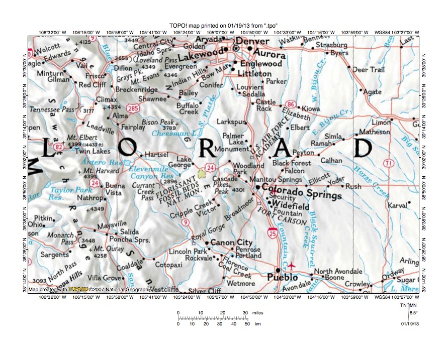 Figure 1: South Platte River-Arkansas River drainage divide area location map (select and click on maps to enlarge). National Geographic Society map digitally presented using National Geographic Society TOPO software.