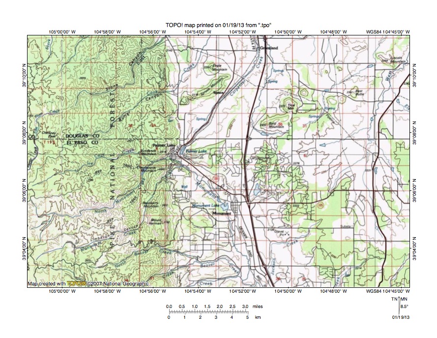 Figure 7: Cherry Creek-Monument Creek drainage divide area. United States Geological Survey map digitally presented using National Geographic Society TOPO software.