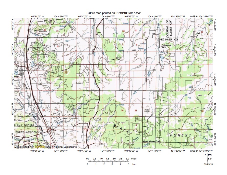 Figure 1 provides a location map for the South Platte River-Arkansas River drainage divide area in northern El Paso County, Colorado and illustrates a region in east central Colorado. Denver is located near the north center edge of figure 1, Colorado Springs is south of Denver, and Pueblo is located near the south edge of figure 1. Tennessee Pass is located in the northwest quadrant of figure 1. The Arkansas River originates on the south side of Tennessee Pass and flows in a south-southeast direction to Coaldale and then in an east-northeast direction to near Royal Gorge before turning in a southeast direction to flow to Pueblo and the south edge of figure 1. South and east of figure 1 the Arkansas River flows in an east and southeast direction and eventually reaches the south oriented Mississippi River. Fountain Creek is a southeast and south oriented tributary originating near Woodland Park and flowing through Colorado Springs before joining the Arkansas River at Pueblo. East of Fountain Creek Black Squirrel Creek originates in the region between Black Forest and Peyton and then flows in a south direction to join the Arkansas River near North Avondale. Big Sandy Creek also originates in the Peyton area and flows in a northeast direction to Limon before turning in a southeast direction to flow to the east center edge of figure 1. East of figure 1 Big Sandy Creek flows in a southeast and south direction to join the Arkansas River. Alma is a town located east of Tennessee Pass. The Middle Fork South Platte River flows in a south-southeast direction from Alma to Hartsel where it joins the South Fork South Platte River to form the South Platte River, which then flows in a southeast direction to Elevenmile Canyon Reservoir before turning to flow in a north-northeast direction to Denver and the north edge of figure 1. North of figure 1 the South Platte River flows in a north-northeast direction before turning in a southeast, east, and northeast direction to flow into western Nebraska with water eventually reaching the Missouri River, which flows to the Mississippi River. North oriented streams flowing to the north edge of figure 1 east of Denver are South Platte River tributaries and join the southeast oriented South Platte River segment north of figure 1. El Paso County is the county in which Colorado Springs is located and includes the towns of Palmer Lake, Black Forest, and Peyton. Woodland Park is located just west of the El Paso County western border. The Rampart Range is located west of Colorado Springs and the region east of Colorado Springs is the Colorado Piedmont. The South Platte River-Arkansas River drainage divide area investigated in this essay is located east of Woodland Park and west of Peyton.