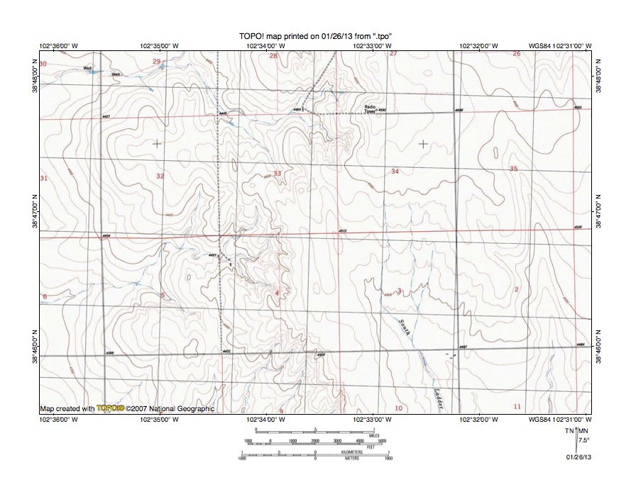 Figure 9: South Ladder Creek-Big Sandy Creek drainage divide area. United States Geological Survey map digitally presented using National Geographic Society TOPO software.