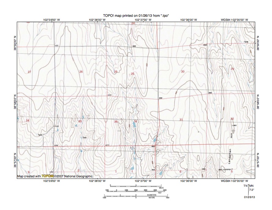 Figure 3: North Fork Smoky Hill River-Big Sandy Creek drainage divide area. United States Geological Survey map digitally presented using National Geographic Society TOPO software.