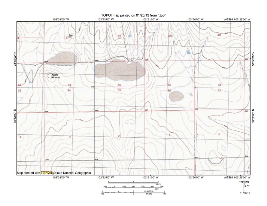 Figure 1 provides a location map for the Big Sandy Creek-Smoky Hill River drainage divide area in Cheyenne County, Colorado and illustrates a region in eastern Colorado with a thin strip of western Kansas to the east. Colorado Springs is located near the west center edge of figure 1 and Pueblo is located near the southwest corner of figure 1. The Arkansas River flows in an east-southeast and east direction from Pueblo to Syracuse near the southeast corner of figure 1. South and east of figure 1 the Arkansas River eventually flows to the Mississippi River. Big Sandy Creek originates north and east of Colorado Springs and flows in an east-northeast and then north-northeast direction through Ramah and Simla before turning in a southeast direction to flow to Limon, Hugo, Boyero, Wild Horse, and Kit Carson and then to turn in a south direction to join the east oriented Arkansas River. Rush Creek is a southeast oriented Big Sandy Creek tributary with southeast oriented headwaters originating south of the northeast oriented Big Sandy Creek headwaters. Relatively few tributaries are shown joining Big Sandy Creek from the north and east. Instead the headwaters of northeast and east oriented drainage routes originate near the southeast oriented Big Sandy Creek segment. The northeast oriented South Fork Republican River originates east of Hugo and flows to the north edge of figure 1 (east half). North and east of figure 1 the South Fork Republican River flows into southern Nebraska to join the east oriented Republican River with water eventually reaching the Kansas, Missouri, and Mississippi Rivers. The North Fork Smoky Hill River originates north of Kit Carson and flows in an east-northeast and east direction to the east edge of figure 1 (north half). East of figure 1 the North Fork Smoky Hill River flows to the Smoky Hill River with water eventually reaching the Kansas, Missouri, and Mississippi Rivers. The Smoky Hill River (unlabeled in figure 1) is located south of the North Fork Smoky Hill River and flows in an east direction to the east edge of figure 1 (near Wallace). South of the Smoky Hill River is Ladder Creek which is a Smoky Hill River tributary. The unlabeled east-southeast oriented stream south of Ladder Creek is White Woman Creek, which east of figure 1 disappears as a surface drainage route. The Big Sandy Creek-Smoky Hill River drainage divide area investigated in this essay includes the North Fork Smoky Hill River-Big Sandy Creek drainage divide north of Kit Carson and extends south along the Big Sandy Creek valley wall to the Ladder Creek headwaters area.