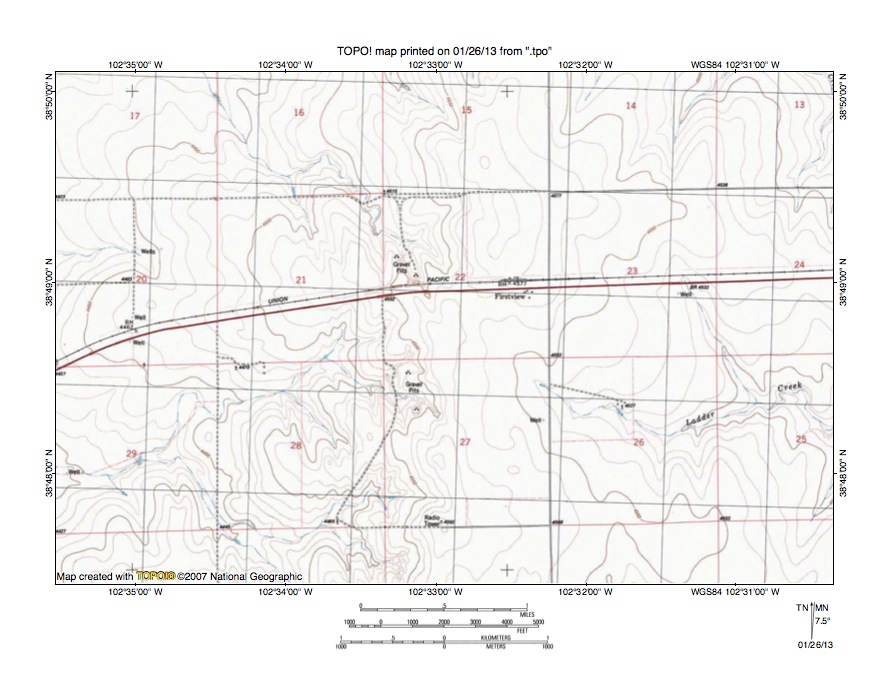 Figure 8 provides a detailed topographic map of the Eureka Creek-Ladder Creek drainage divide seen in less detail figure 7. The map contour interval for figure 8 is 10 feet. Firstview is a railroad siding located near the center of figure 8. Ladder Creek originates near the east edge of section 27 (south of Firstview) and flows in an east direction to the east edge of figure 8 (south half). East of figure 8 Ladder Creek flows in a southeast, east, southeast, east, and north direction before finally joining the east oriented Smoky Hill River with water eventually reaching the Kansas, Missouri, and Mississippi Rivers. A northwest oriented intermittent stream originates in the northwest quadrant of section 22 and flows to the north edge of section 8 (west half). North of figure 8 that stream disappears as a surface stream, but it is headed toward south oriented Eureka Creek. West oriented intermittent streams flowing to the west edge of figure 8 in sections 20 and 29 also disappear as surface streams, but are headed toward south oriented Eureka Creek. While these streams do not actually reach Eureka Creek they would reach Eureka Creek if enough water was present and these streams are treated here as Eureka Creek tributaries. West of figure 8 Eureka Creek flows in a south direction and after joining south oriented Big Spring Creek joins south-southeast and south oriented Big Sandy Creek, which then flows to the east oriented Arkansas River, which eventually flows directly to the Mississippi River. The more detailed topographic map does show a through valley crossing the low hill at Firstview. The through valley links the northwest oriented Eureka Creek tributary valley and one of the west oriented Eureka Creek tributary valleys with the Ladder Creek headwaters valley. The through valley floor elevation is between 4560 and 4570 feet. Elevations in the northeast quadrant of section 22 to the north rise to more than 4590 feet and the Radio Tower in section 34 to the south is located on a hill rising to 4592 feet. These elevations suggest the through valley is at least 20 feet deep. This shallow through valley is a water-eroded valley and was eroded by east and southeast oriented flood flow moving to the actively eroding Ladder Creek valley prior to headward erosion of the deeper south oriented Eureka Creek valley to the west of figure 8. Headward erosion of the deeper south oriented Eureka Creek valley beheaded and reversed the east and southeast oriented flood flow routes to create the west and northwest oriented Eureka Creek tributary drainage routes seen in figure 8.