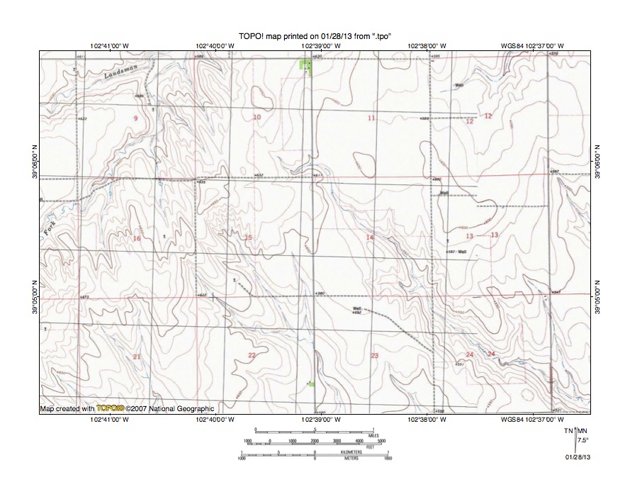 Figure 3: Landsman Creek-North Fork Smoky Hill River drainage divide area. United States Geological Survey map digitally presented using National Geographic Society TOPO software.