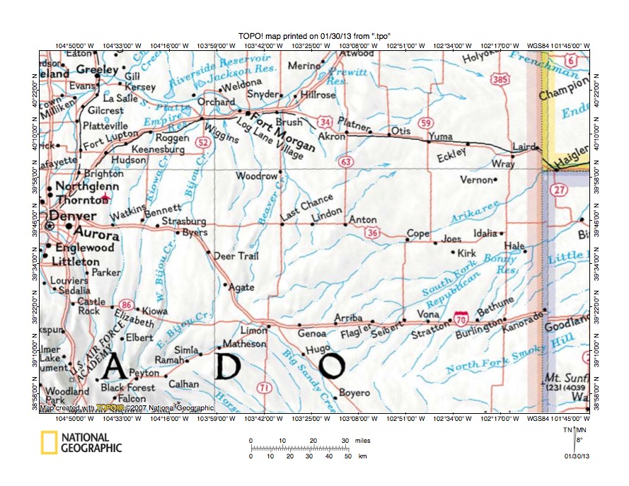 Figure 1: Arikaree River-South Fork Republican River drainage divide area location map (select and click on maps to enlarge). National Geographic Society map digitally presented using National Geographic Society TOPO software.