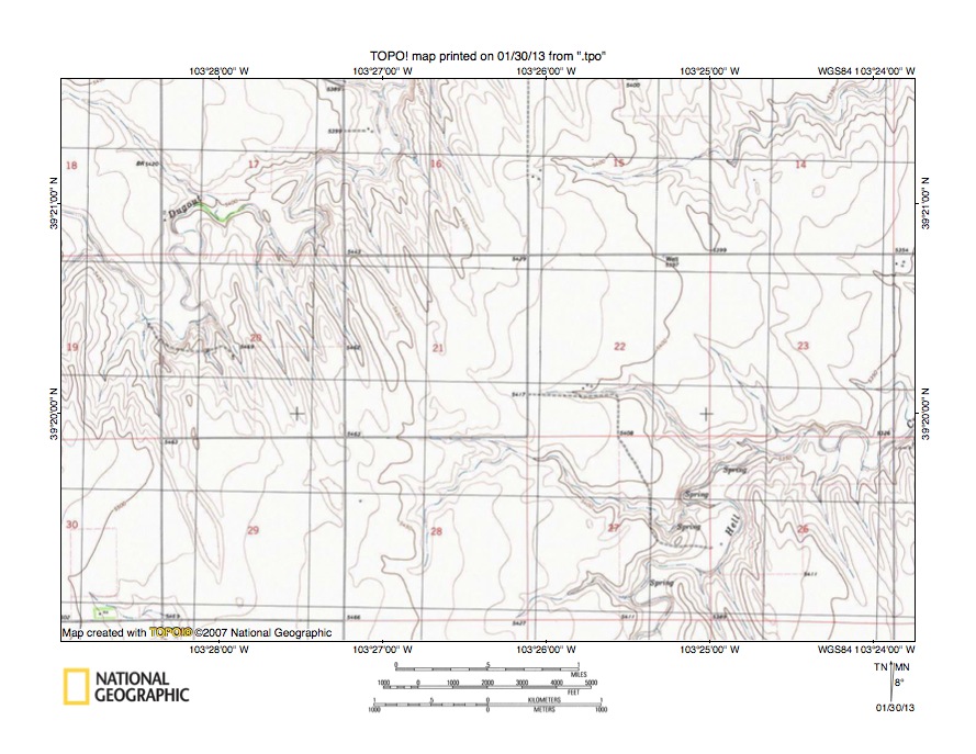 Figure 5: Arikaree River-Buffalo Creek drainage divide area. United States Geological Survey map digitally presented using National Geographic Society TOPO software.
