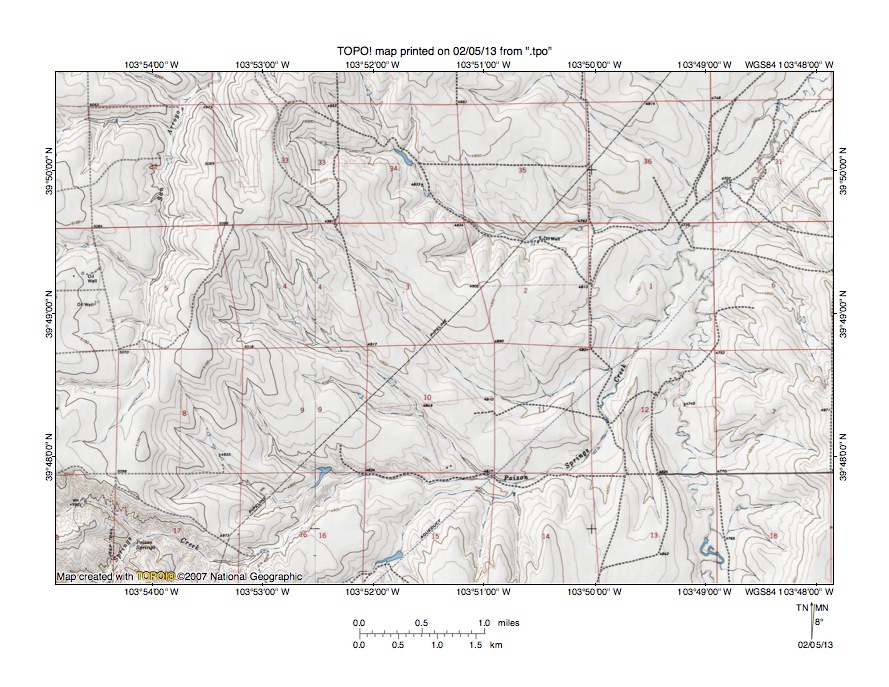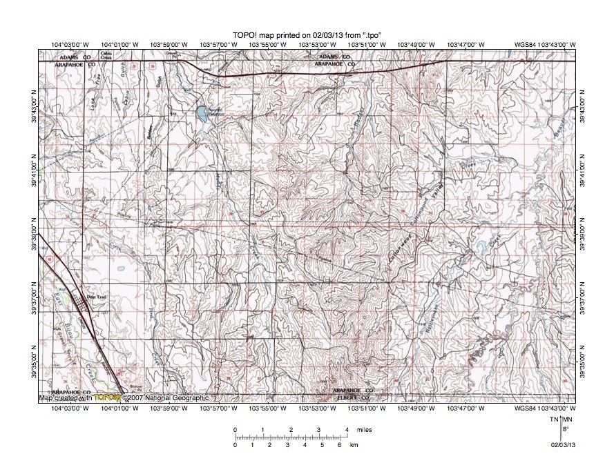 Figure 6: Detailed map of Muddy Creek-East Bijou Creek drainage divide area. United States Geological Survey map digitally presented using National Geographic Society TOPO software.