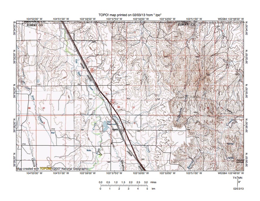 Figure 5 illustrates a topographic map of the Muddy Creek-East Bijou Creek drainage divide area north and slightly west of figure 3 and includes an overlap area with figure 3. The map contour interval for figure 5 is 10 meters. Agate is a small town on the railroad and highway in the south center area of figure 5. Ball Reservoir is located just west of Agate. East Bijou Creek flows in a north-northeast direction from the south edge of figure 5 (west of center) to just west of Ball Reservoir and then turns to flow in a north-northwest direction to the north edge of figure 5 (west half-next to highway and railroad). North of figure 5 East Bijou Creek flows in a north-northwest direction to join West Bijou Creek and to form north-northeast and north oriented Bijou Creek, which flows to the east and northeast oriented South Platte River. Godfrey Gulch drains in a north and north-northwest direction from the south center edge of figure 5 to join East Bijou Creek near Ball Reservoir. Beaver Creek flows in a northeast direction across the southeast corner of figure 5. East of figure 5 Beaver Creek turns to flow in a north, north-northeast, and north direction to eventually join the east and northeast oriented South Platte River. The north oriented stream originating near the center of figure 5 and flowing to the north center edge of figure 5 is Muddy Creek, which north of figure 5 flows in a north-northwest and north direction to join Bijou Creek. The north oriented stream originating in the southeast quadrant of figure 5 (east of Agate) and flowing to the north edge of figure 5 (near the northeast corner) is Rattlesnake Creek, which north of figure 5 flows in a north-northeast direction to join Beaver Creek. Figure 5 illustrates how the present day north oriented East Bijou Creek and Beaver Creek valleys diverge from each other as they extend in north directions toward the east and northeast oriented South Platte River valley and how north oriented tributary valleys are located between the two diverging valleys. Remember these valleys are diverging from the floor of the same through valley seen in figures 3 and 4. Additional evidence supporting the diverging and converging south oriented flood flow channel hypothesis can be seen along drainage divides south of the north oriented Muddy Creek headwaters valleys. Shallow north-to-south oriented through valleys link the north oriented Muddy Creek headwaters valleys with the north-northwest oriented East Bijou Creek valley. These through valleys are defined by only one or two 10-meter contour lines on a side, which suggests at the time south oriented flood flow moved from the present day north oriented Muddy Creek valley to the present day north oriented East Bijou Creek valley floodwaters were flowing on an erosion surface as high (if not higher) than the elevation of the present day East Bijou Creek-Muddy Creek drainage divide. Flood flow on the Muddy Creek alignment was probably beheaded and reversed prior to the reversal of flood flow in the East Bijou Creek valley, which accounts for the deeper East Bijou Creek valley today. This concept is discussed further in the figure 6 discussion.
