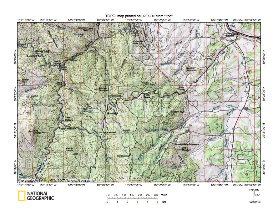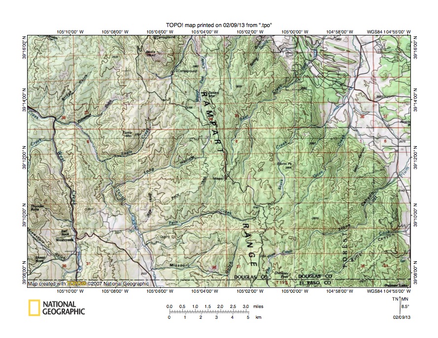 Figure 1: South Platte River-Plum Creek drainage divide area location map (select and click on maps to enlarge). National Geographic Society map digitally presented using National Geographic Society TOPO software.