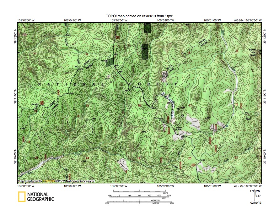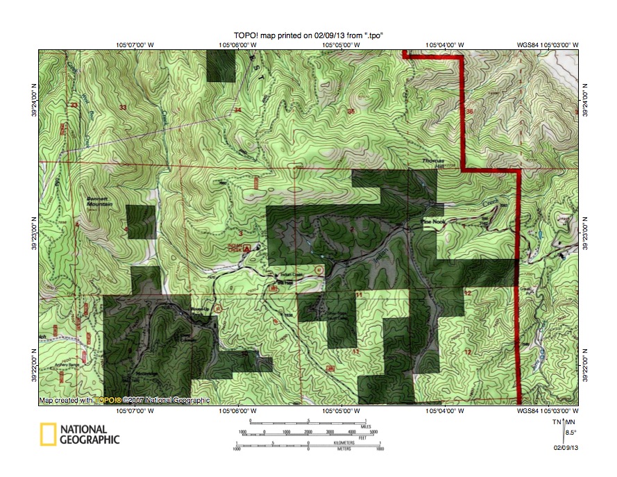 Figure 9: Fern Creek-East Plum Creek drainage divide area. United States Geological Survey map digitally presented using National Geographic Society TOPO software.
