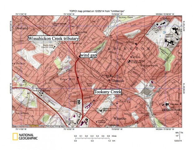 Figure 13: South and east of figure 12 is the Wissahickon Creek-Tookany Creek drainage divide. Tookany Creek becomes Tacony Creek and then Frankford Creek as it flows in a south direction from Glenside to the Delaware River. The railroad line from Oreland (near northwest corner of map) to Jenkintown passes through a wind gap linking headwaters of a west oriented stream which joins south oriented Wissahickon Creek in the Whitemarsh Valley with the east and south oriented Tookany-Tacony-Frankford Creek valley. The wind gap elevation today is about 320 feet, although the railroad may have lowered the elevation by ten or more feet. The highway near the Westminster Theological Seminary (southwest quadrant of map) passes through a wind gap with an elevation of approximately 350 feet. These and other wind gaps demonstrate that water once flowed from the Wissahickon Creek drainage basin to the Tookany-Tacony-Frankford Creek drainage basin and then to the Delaware River. Elevations surrounding the Wissahickon Gorge to the west of figure 13 are at least 50 feet higher than elevations in these wind gaps. United States Geological Survey map presented using National Geographic TOPO software.