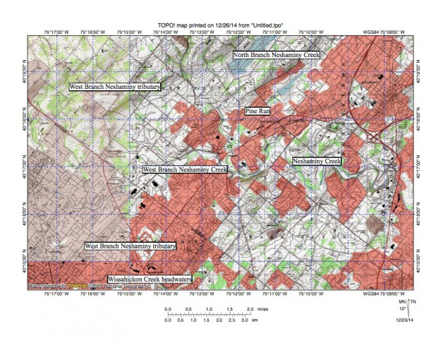 Figure 2: Reduced size topographic map illustrating Wissahickon Creek headwaters relationship to the Neshaminy Creek headwaters. The West Branch Neshaminy Creek flows in a south-southeast and then northeast and east direction from the map northwest corner to Chalfont, near the map center, where it joins the North Branch to form Neshaminy Creek. The northernmost marked West Branch tributary flows in a southwest direction to join east oriented West Branch Neshaminy Creek, while the southern marked West Branch tributary flows in a northeast direction. The North Branch Neshaminy Creek and its tributary Pine Run both flow in southwest directions before turning to flow in a south direction to join east-oriented Neshaminy Creek (which east of figure 3 turns to flow in a south-southeast direction to join the Delaware River). The southwest oriented North Branch Neshaminy Creek, Pine Run, and West Branch Neshaminy Creek tributary all provide evidence that headward erosion of the Neshaminy Creek valley captured multiple southwest-oriented channels. The northeast oriented West Branch Neshaminy Creek tributary shown was created by a reversal of flow on the northeast end of a beheaded southwest oriented flow channel. The southwest oriented Wissahickon Creek headwaters are a relic of southwest oriented drainage routes that preceded the present day drainage system. United States Geological Survey map presented using National Geographic TOPO software.