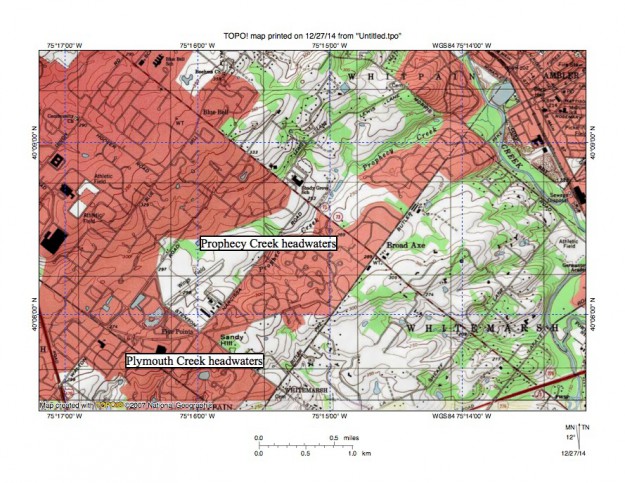 Figure 9: A shallow northeast to southwest oriented valley with an elevation of slightly less than 300 feet in the Wing Field area links the northeast oriented Prophecy Creek headwaters valley with the southwest oriented Plymouth Creek headwaters. Prophecy Creek flows to southeast oriented Wissahickon Creek as a barbed tributary. Valleys with elevations of slightly more than 200 feet link the Wissahickon Creek valley with Plymouth Creek just south of figure 9. United States Geological Survey map presented using National Geographic TOPO software.