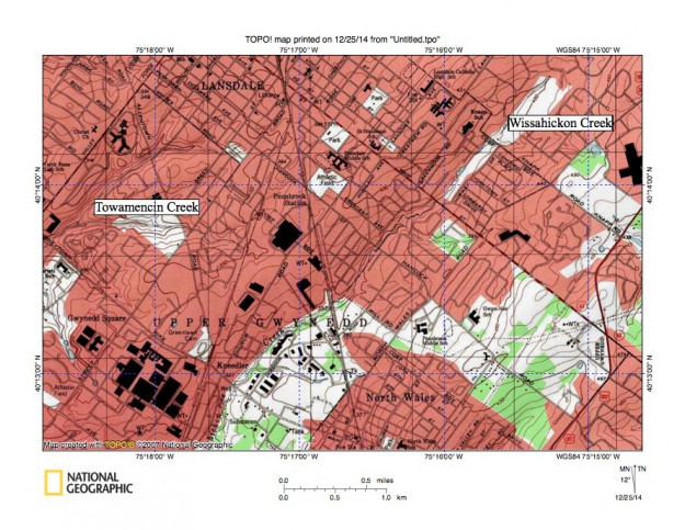 Figure 4: Relationship of southwest oriented Wissahickon Creek headwaters to southwest oriented Towamencin Creek headwaters. West of map Towamencin Creek flows to south and southwest oriented Skippack Creek, which then flows to south oriented Perkiomen Creek, which in turn flows to the southeast oriented Schuylkill River. Southwest oriented Towamencin Creek headwaters along with the southwest oriented Wissahickon Creek headwaters are relics of the southwest oriented drainage routes that once crossed the region. United States Geological Survey map presented using National Geographic TOPO software.