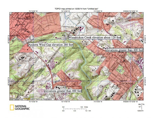 Figure 14: North entrance to the Wissahickon Creek gorge at the Philadelphia city line. The city line is marked and extends in a northeast direction from near map southwest corner to just east of the map north center edge. Wissahickon Creek is flowing at an elevation of approximately 120 feet where it enters the gorge. Elevations greater than 400 feet can be found on either side of gorge meaning the gorge is approximately 300 feet deep. The marked Andorra Wind Gap links the valleys of a northeast oriented Wissahickon Creek tributary and a southwest oriented Schuylkill River tributary and has an elevation of 266 feet. United States Geological Survey map presented using National Geographic TOPO software.